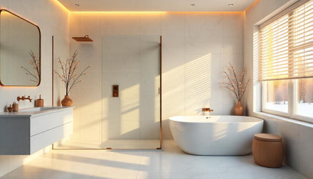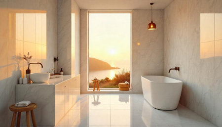 Minimalist bathroom with ocean view and warm sunrise lighting
