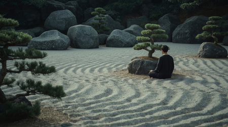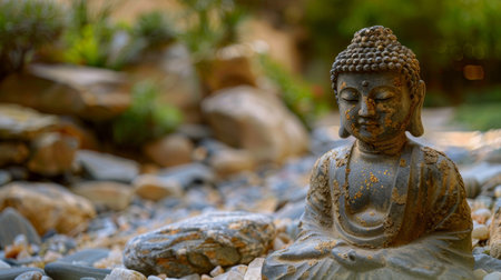 Buddha statue in a Japanese rock garden with a minimalistic and peaceful composition.