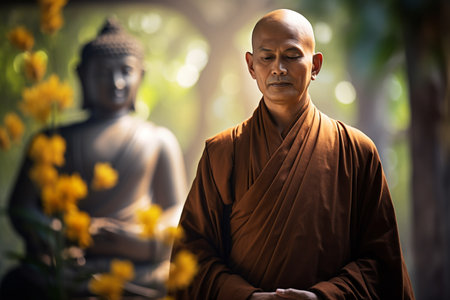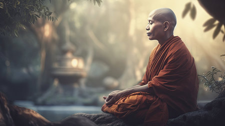 Serene practice - buddhism with buddhist monk meditating, highlighting peacefulness and spiritual depth of meditation, emphasizing importance of mindfulness, inner tranquility in buddhist tradition