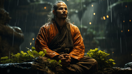 Tranquil monk meditates in ancient forest near famous pagoda monument generated by artificial intelligence