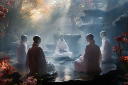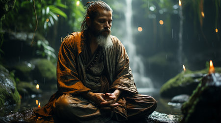 Buddhist monks meditating near the mountain waterfall. Spiritual contemplation with breathtaking scenery.