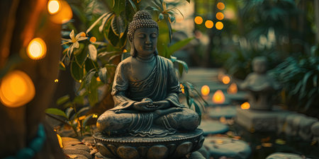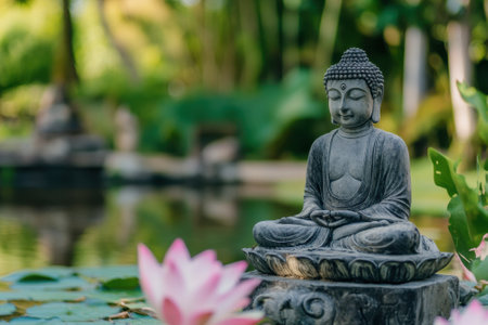 Buddha sits peacefully among blooming lotus flowers in a tranquil garden, reflecting harmony and serenity.