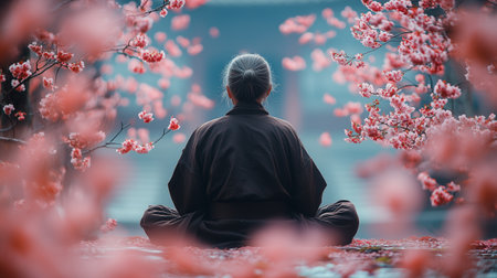 Rear view of person sitting with crossed legs and meditating surrounded with beautiful cherry blossom. Zen buddhism and inner peace concept. Generative AI