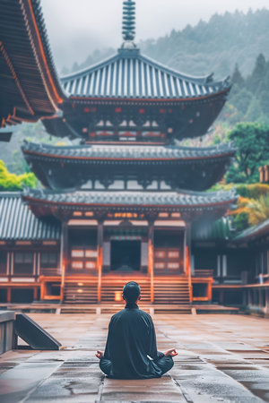 Male in cultural Japanese attire stands at Shaolin-style monastery, evoking martial arts tradition, serenity, and heritage.
