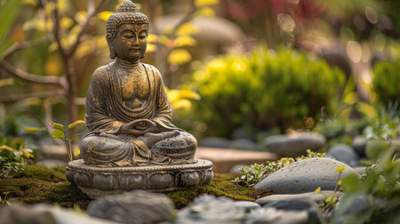 A Buddha statue sits atop a rock in a serene garden setting, A quiet moment of reflection in a garden, AI Generated