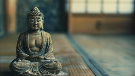 An AI generated illustration of Buddha statue in lotus pose on the Zen Temple interior background