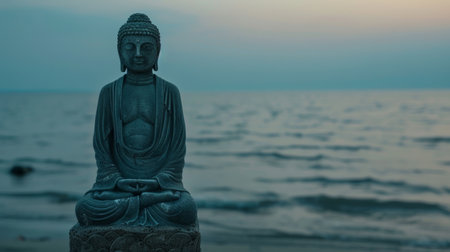 A tranquil Buddha statue rests on calm water, reflecting the warm tones of twilight. This serene scene evokes feelings of peace and mindfulness, perfect for calming visuals.