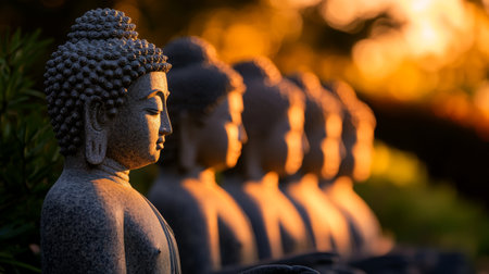 A row of tranquil Buddha statues bathed in soft sunset light creates a serene atmosphere, perfect for evoking peace and reflection in any setting.
