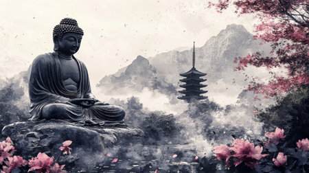 A serene Buddha sits peacefully on a rock amidst colorful flowers and misty rain, framed by a pagoda and lush trees in a tranquil Japanese setting.