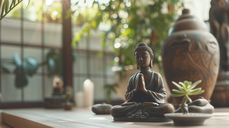 A small statue of Buddha sits in the corner emanating a sense of tranquility and wisdom throughout the space. 2d flat cartoon