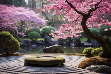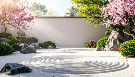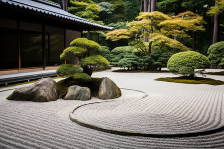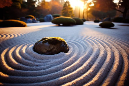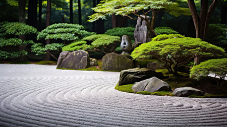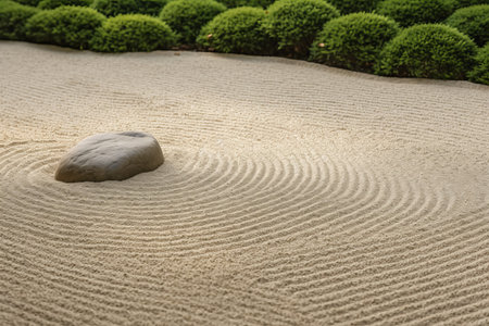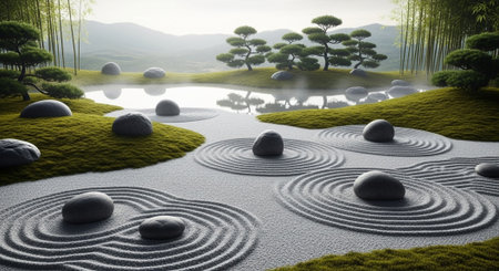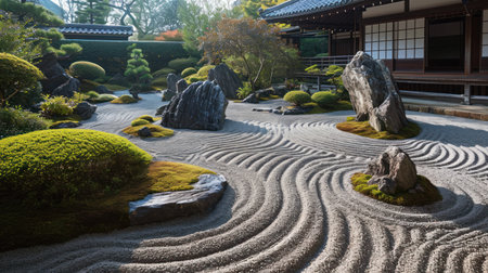 Tranquil japanese zen garden with raked sand and serene stone arrangements