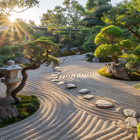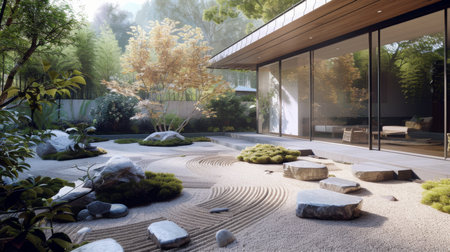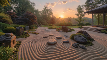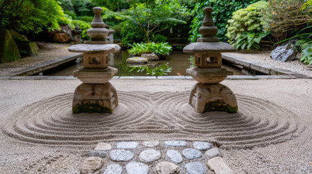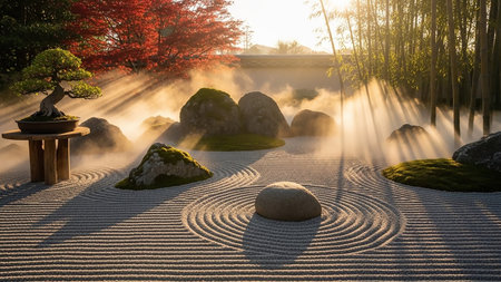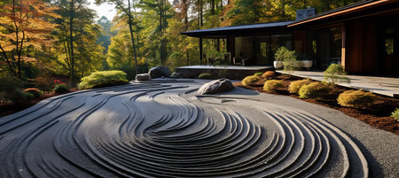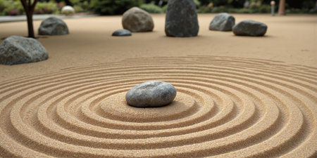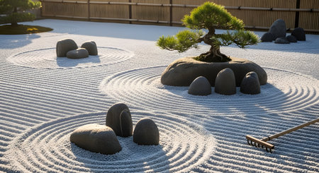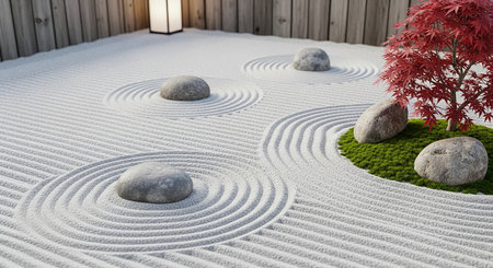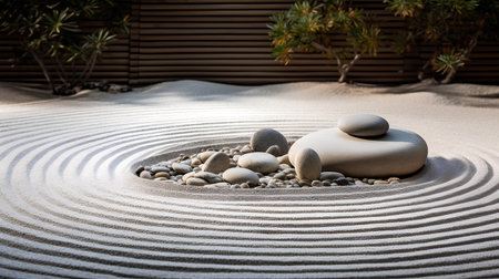 Zen garden with stone bowls and raked sand for tranquility and mindfulness