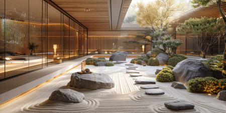 Experience the tranquility of a Zen garden featuring arranged stones and raked sand, inviting mindfulness and serenity amidst nature's beauty and artistry.