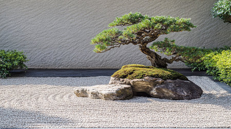 This image showcases a meticulously crafted Japanese Zen garden. The scene features carefully placed rocks and a gracefully shaped tree, all set against a backdrop of raked gravel. The composition is serene, with neutral tones and soft lighting that suggests a sense of peace. Suitable for editorial and commercial applications.