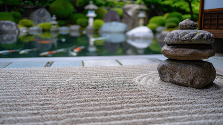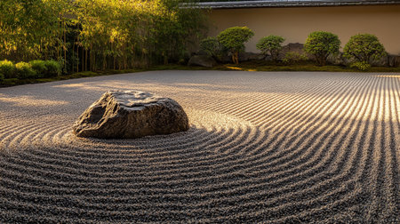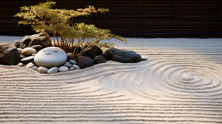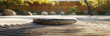 A peaceful moment of reflection in a Zen garden, the meticulously arranged stones and raked sand facilitating meditation and mindfulness.