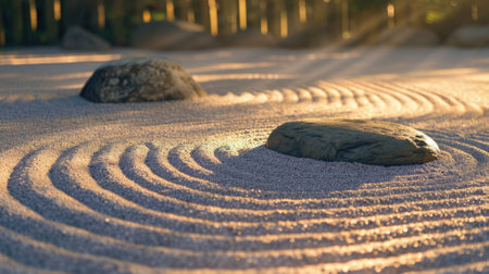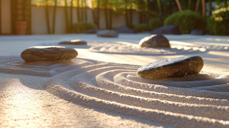 Serenity in a Zen garden with smooth stones arranged on raked sand, creating calming patterns for meditation and tranquility seekers.