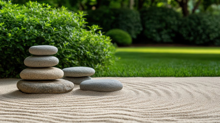 A tranquil Zen garden featuring stacked stones and raked sand evokes peace