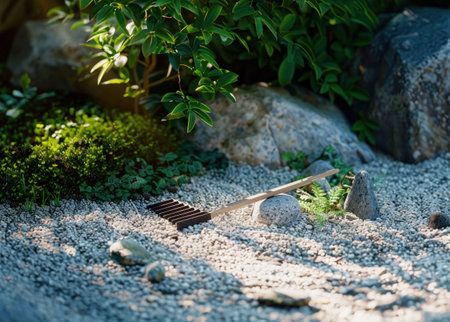 Zen garden scene with a rake on gravel surrounded by greenery and rocks