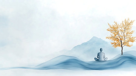 Silhouette of man meditating in lotus position with tree