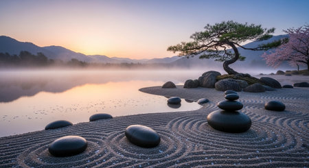 Experience the peaceful beauty of a Zen Garden with sand circles and smooth stones. Tranquil Zen garden featuring meticulously arranged sand circles surrounded by smooth, round stones.