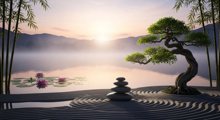 Zen garden with zen stones and bonsai tree. 3d render