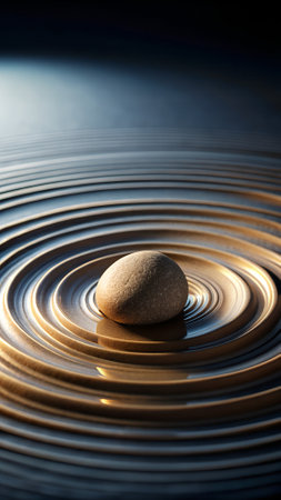 Tranquil zen rock garden with circular patterns in white sand top view for serene reflection