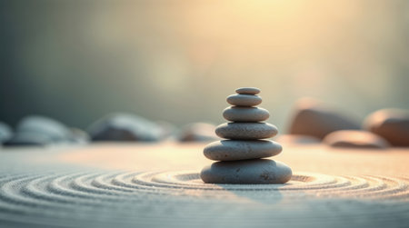 This image showcases a Zen garden arrangement with stacked stones on patterned sand. The composition features soft lighting and muted colors, emphasizing textures. This peaceful scene depicts harmony and balance. Suitable for use in various commercial and editorial contexts related to mindfulness or relaxation.