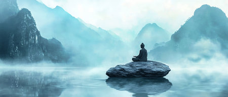 A serene Buddha statue meditates gracefully on a floating rock in a tranquil mountain lake, surrounded by misty peaks and a soothing blue color palette, evoking peace and zen energy.