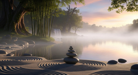 Serenity in a Zen garden with smooth stones arranged on raked sand, creating calming patterns for meditation and tranquility seekers.