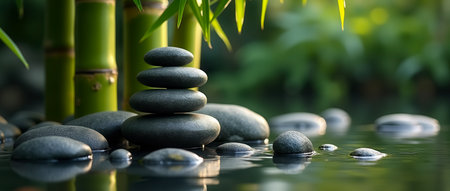 Basalt stones are carefully balanced next to still water reflecting lush bamboo. Peaceful setting in a garden captures relaxation and mindfulness. Concept of wellness, meditation, spa.