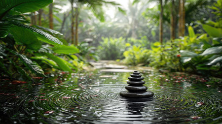 A pile of dark stones stands centered in calm water, surrounded by vibrant green foliage. The composition features a natural outdoor environment, possibly a garden or forest. The lighting suggests a diffused daylight. This image could be used for wellness, meditation, or nature-related projects.