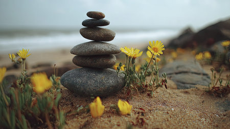 A balanced stack of stones sits on sandy terrain, with vibrant yellow flowers in the foreground. The composition features soft lighting, suggesting a daytime outdoor environment. Its serene aesthetic is suitable for illustrating themes of balance, nature, mindfulness, and well-being, potentially appealing to various commercial and editorial applications.