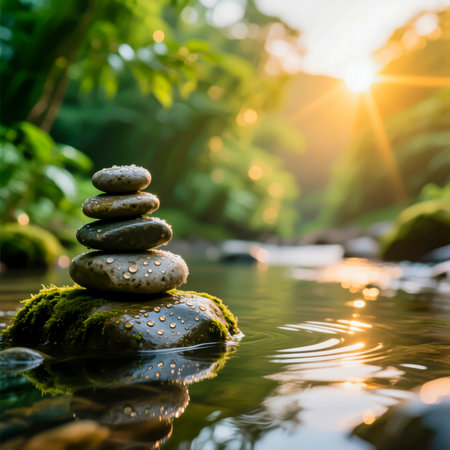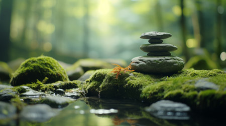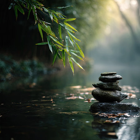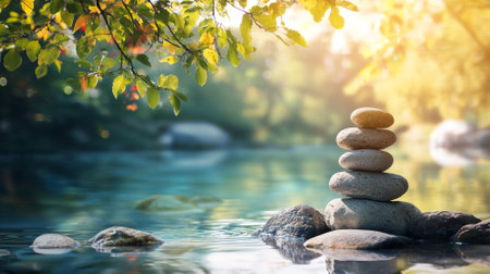 A serene composition featuring a stack of balanced stones in a calm river, surrounded by a lush, misty forest. this peaceful nature scene evokes tranquility and harmony, perfect for mindfulness, meditation, or relaxation themes. Generative AI