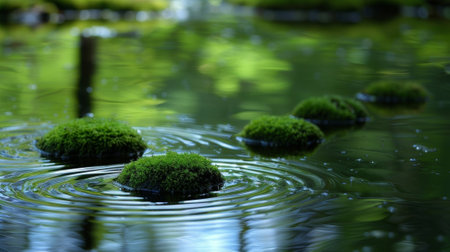 A serene scene featuring smooth stones placed on a tranquil water surface, reflecting the surrounding nature. Perfect for relaxation and nature themes.