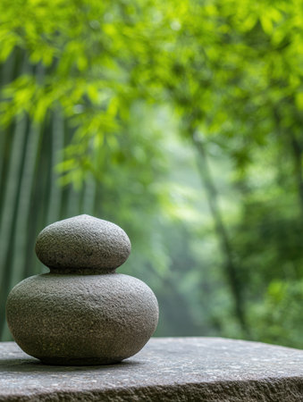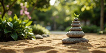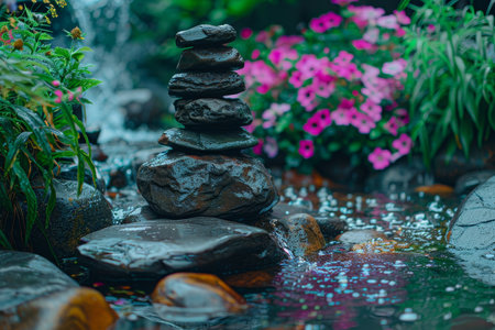 A tranquil zen garden scene featuring a carefully balanced arrangement of stones, embodying peace and harmony, ideal for inspiring relaxation and mindfulness in photography.