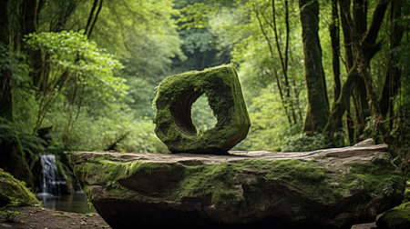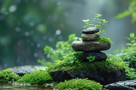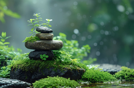 A calming stack of three smooth, dark stones perfectly balanced on vibrant green moss. sunlight filters through the forest, creating a peaceful and meditative scene.