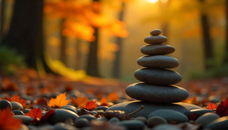 Zen stones stacked by a misty lake surrounded by autumn leaves