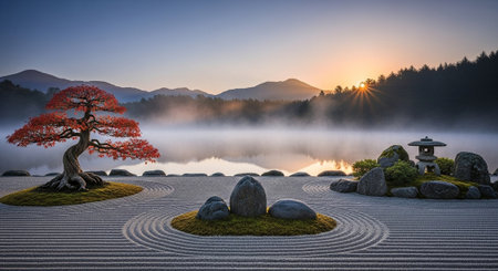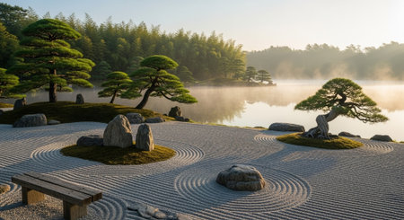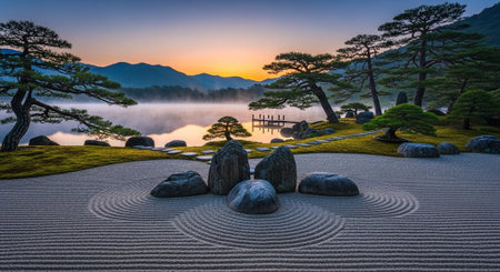 Serene Japanese zen garden featuring raked sand and rocks in minimalist design