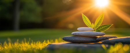A tranquil stack of stones accompanied by green leaves, bathed in warm sunlight