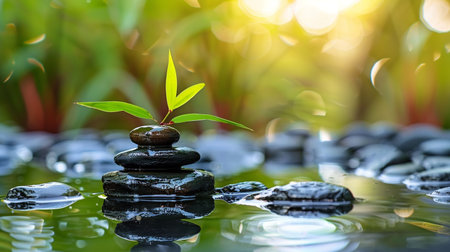 A stack of balanced stones sits in tranquil water, accented by green bamboo leaves. The composition is bathed in soft, diffused light, suggesting a natural setting. The image evokes a sense of calm and balance, suitable for editorial and commercial applications. The scene represents a concept of harmony.