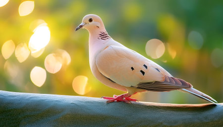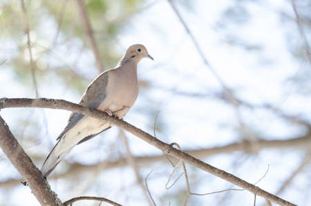 Mourning Turtle Dove (Zenaida macroura) resting on a tree branch in morning stillness. luminescent sunlight