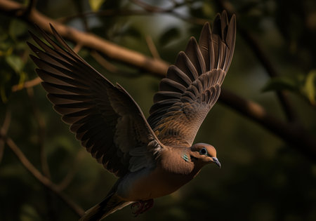 Mourning dove in mid flight, wings fully extended, soaring through a dark, lush forest. graceful bird captured with natural light, symbolizing freedom, peace, and nature beauty.
