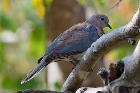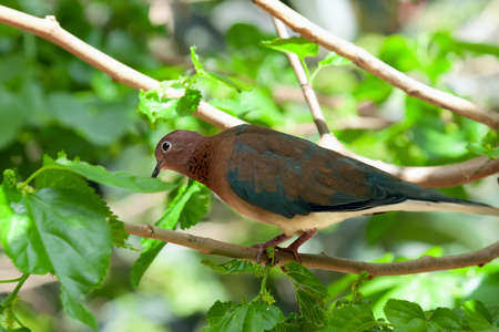 Side view of brown zenaida dove sitting on the branch of a tropical or Indian almond tree with blurred leaves in the background. Great for bird, animal or nature images, banners and posters.