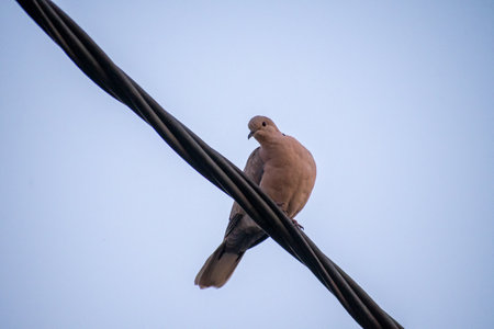 A mourning dove perches gracefully on a thick wire against a pale blue sky, a tranquil moment.