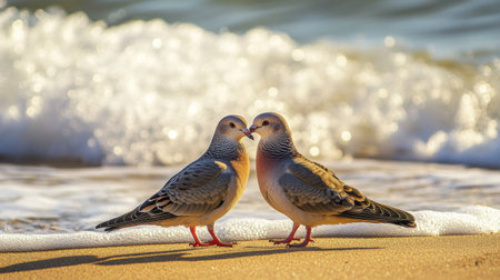 Two lovely birds stand close together on a sandy beach, with gentle ocean waves lapping in the background, creating a serene and romantic atmosphere.