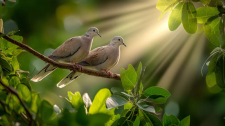 Two doves perched on a branch bask in soft sunlight filtering through vibrant green leaves, creating a tranquil and serene atmosphere in a lush natural setting.