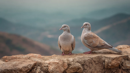 This stunning image features two pigeons perched gracefully on a rocky ledge, with a breathtaking mountain landscape and soft cloudy sky in the background.