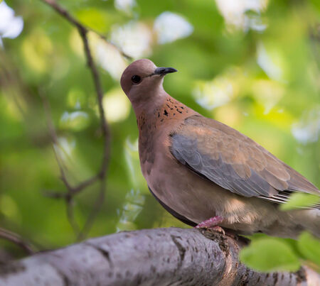 Turtle dove sitting on the tree branch on green background. Down view. Birds and nature