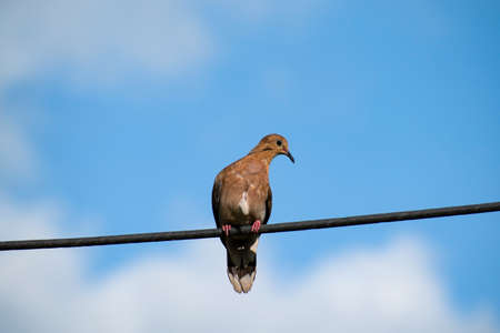 One brown zenaida aurita dove looking towards his left side. Bird is sitting on a black wire or power line with a blurred background of the blue sky and white clouds.