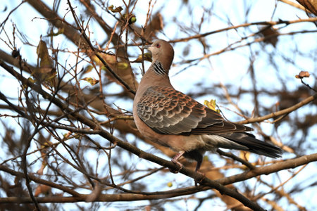 A pigeon is perched on a branch of a tree. The bird is brown and black with a white head. The image has a peaceful and serene mood, as the bird is sitting calmly on the branch